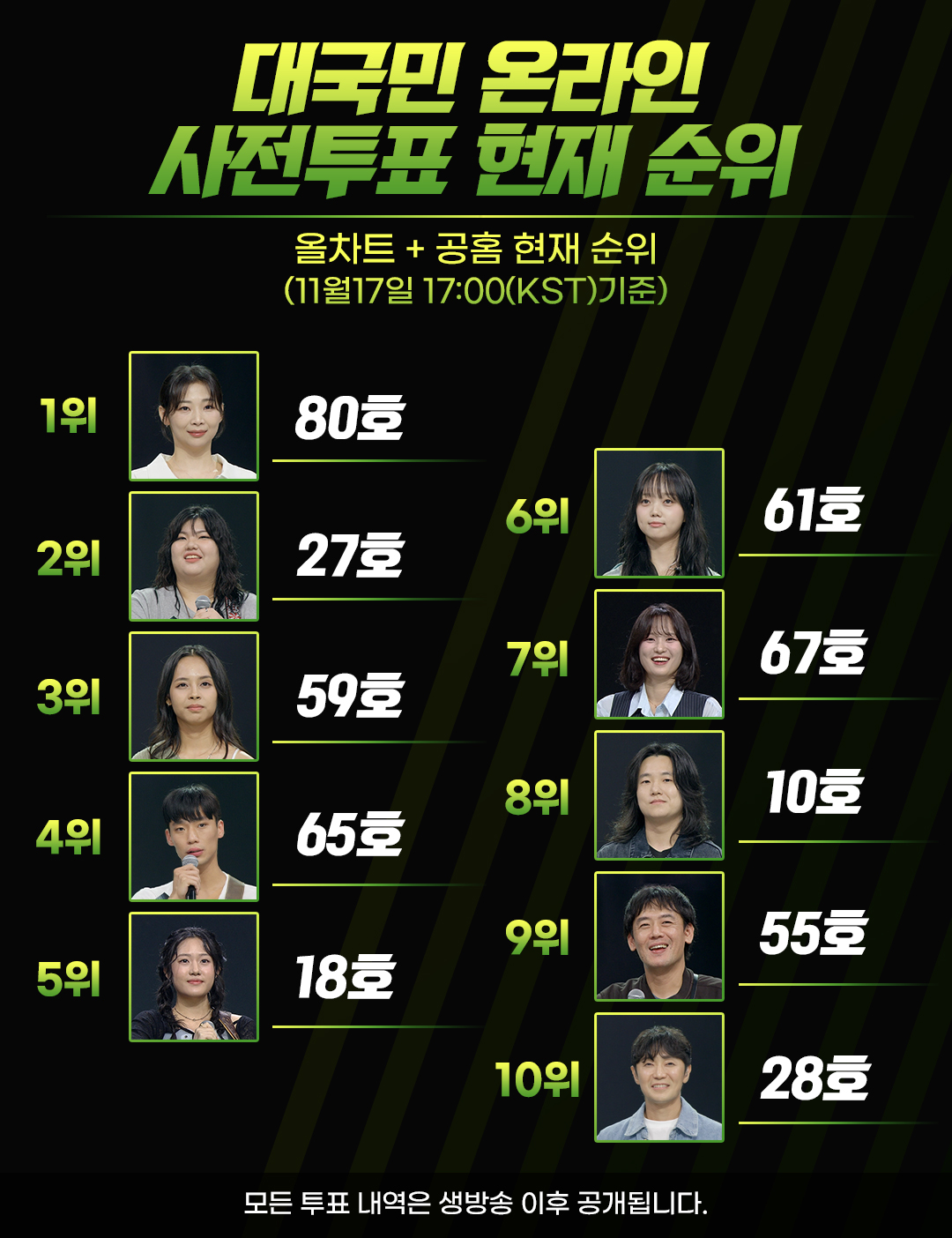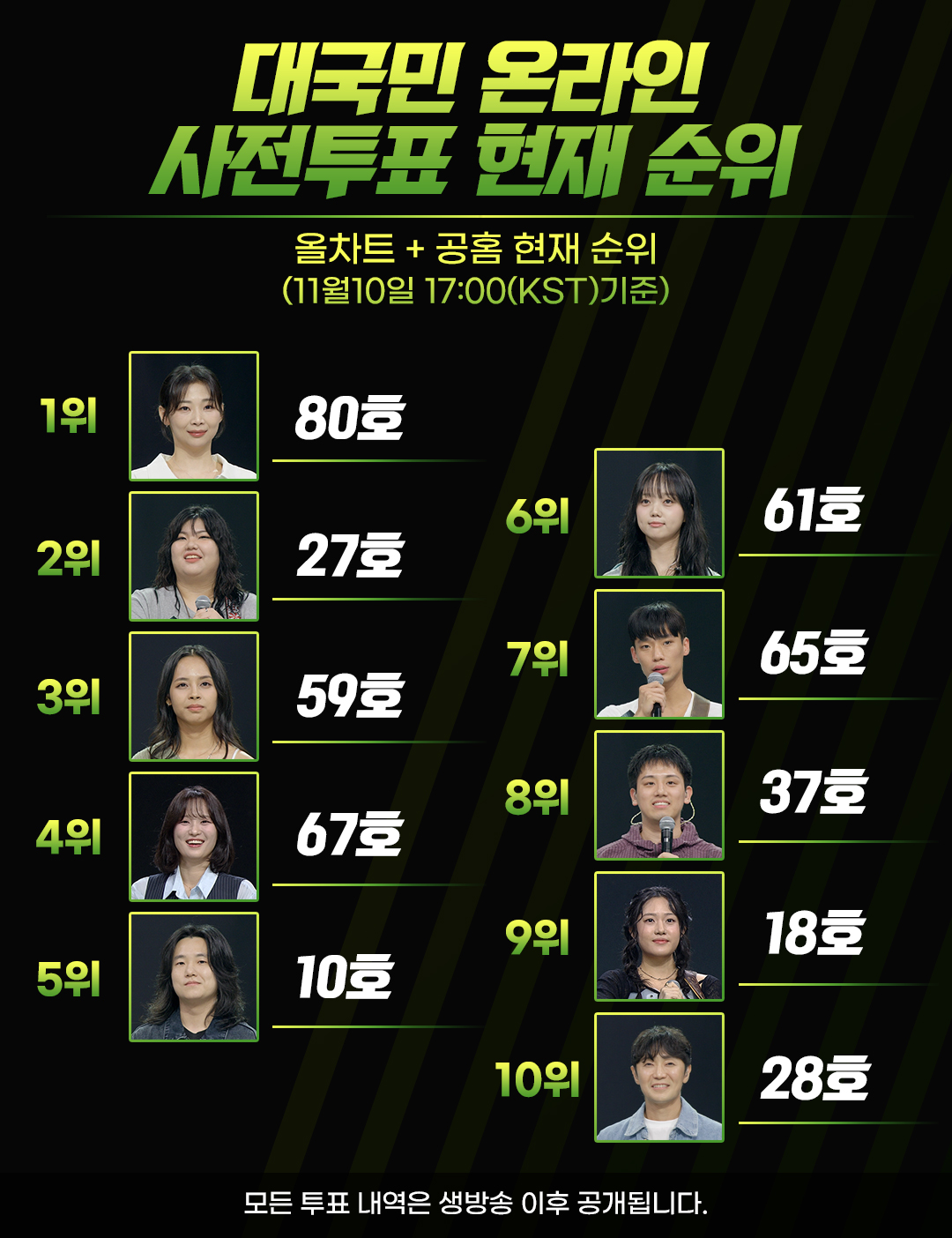 - ↑ (KR) ALLCHART: 대국민 온라인 사전투표 현재 순위 올차트 + 공홈 현재 순위 (11월17일 17:00(KST)기준)